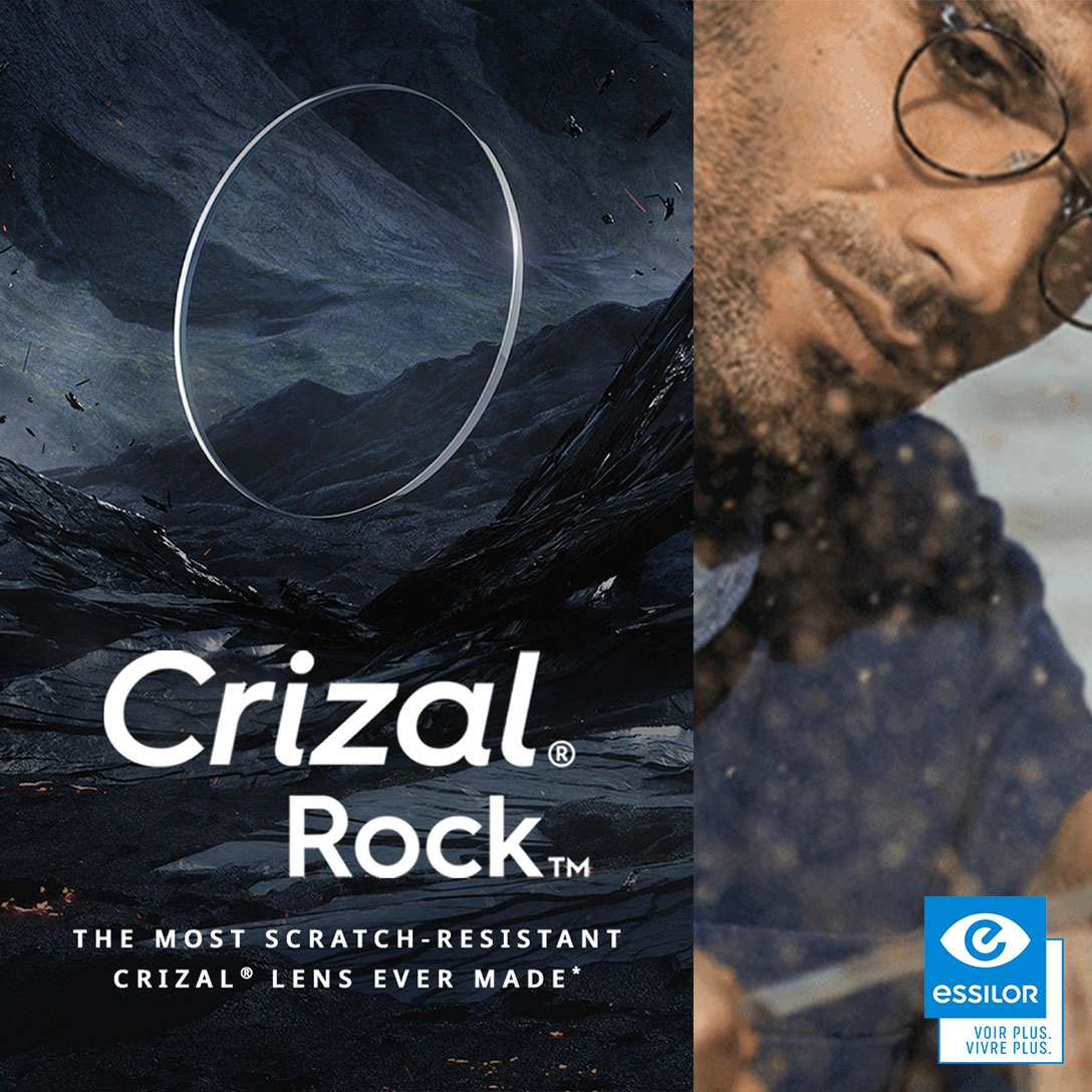 Crizal Rock™ lenses by Essilor are designed for people who want long-lasting clarity with exceptional resistance to scratches and smudges. Engineered for real-world use, Crizal Rock™ keeps your lenses cleaner, clearer, and more durable—day after day.