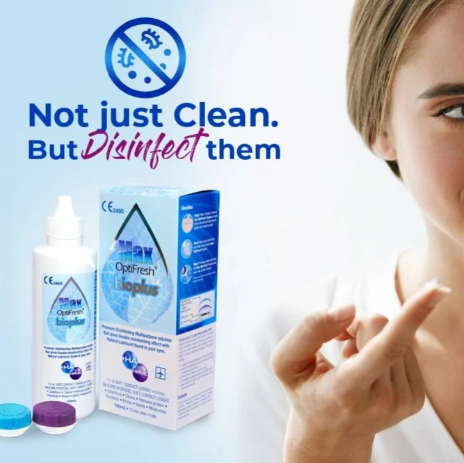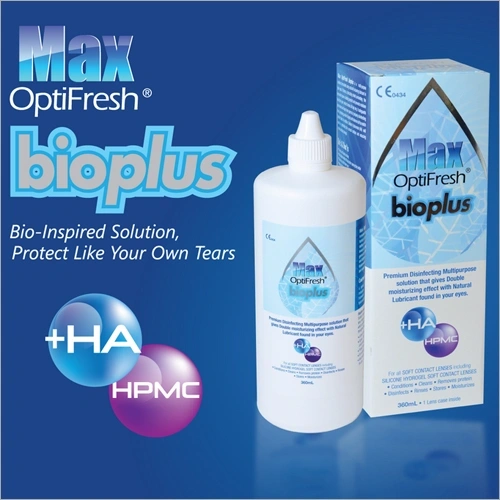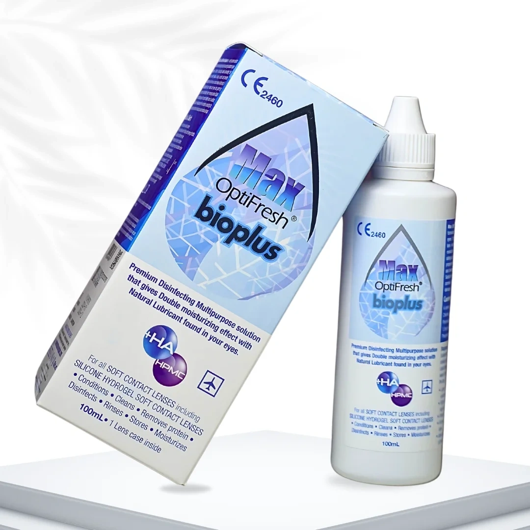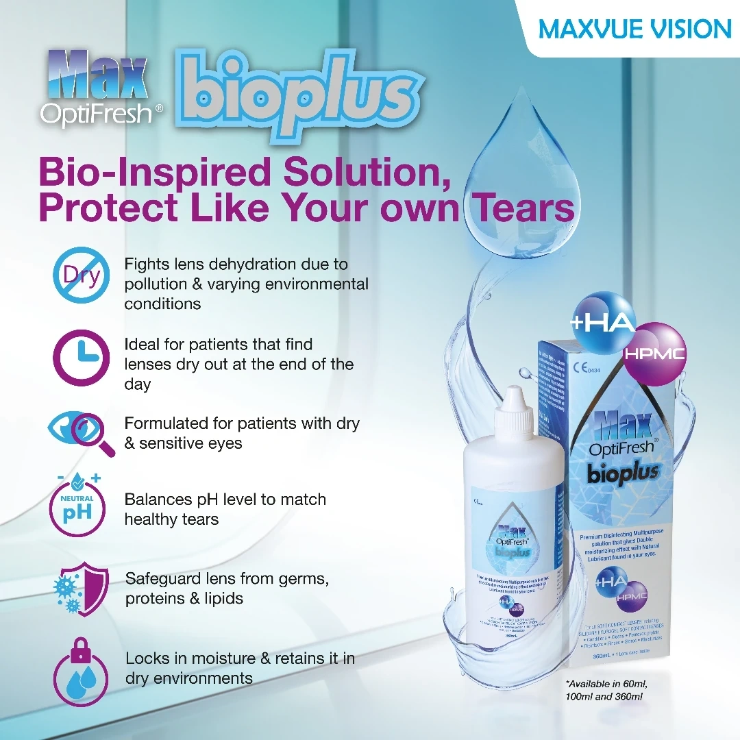 Max OptiFresh® bioplus™ is a multi-purpose solution formulated using naturally occurring lubricant in your eyes. It forms a lubricating shield surrounding the lens which gives a lasting comfort and prevents moisture loss from your contact lenses all day long. It safeguards your lenses and eyes from germs by properly disinfecting them, removing protein & lipids and balances pH to match healthy tears. In addition, Sodium Hyaluronate (HA) will assist in protecting the corneal surface and reducing ocular surface damage.