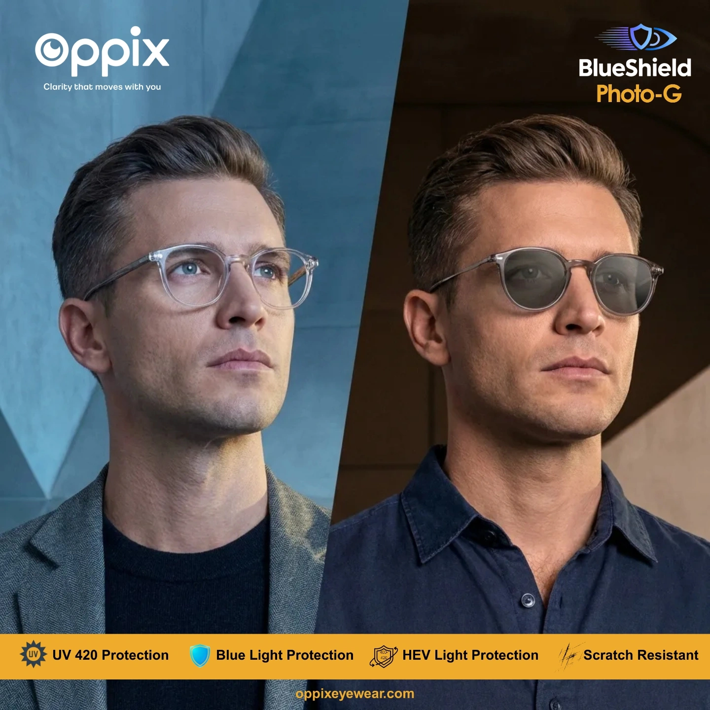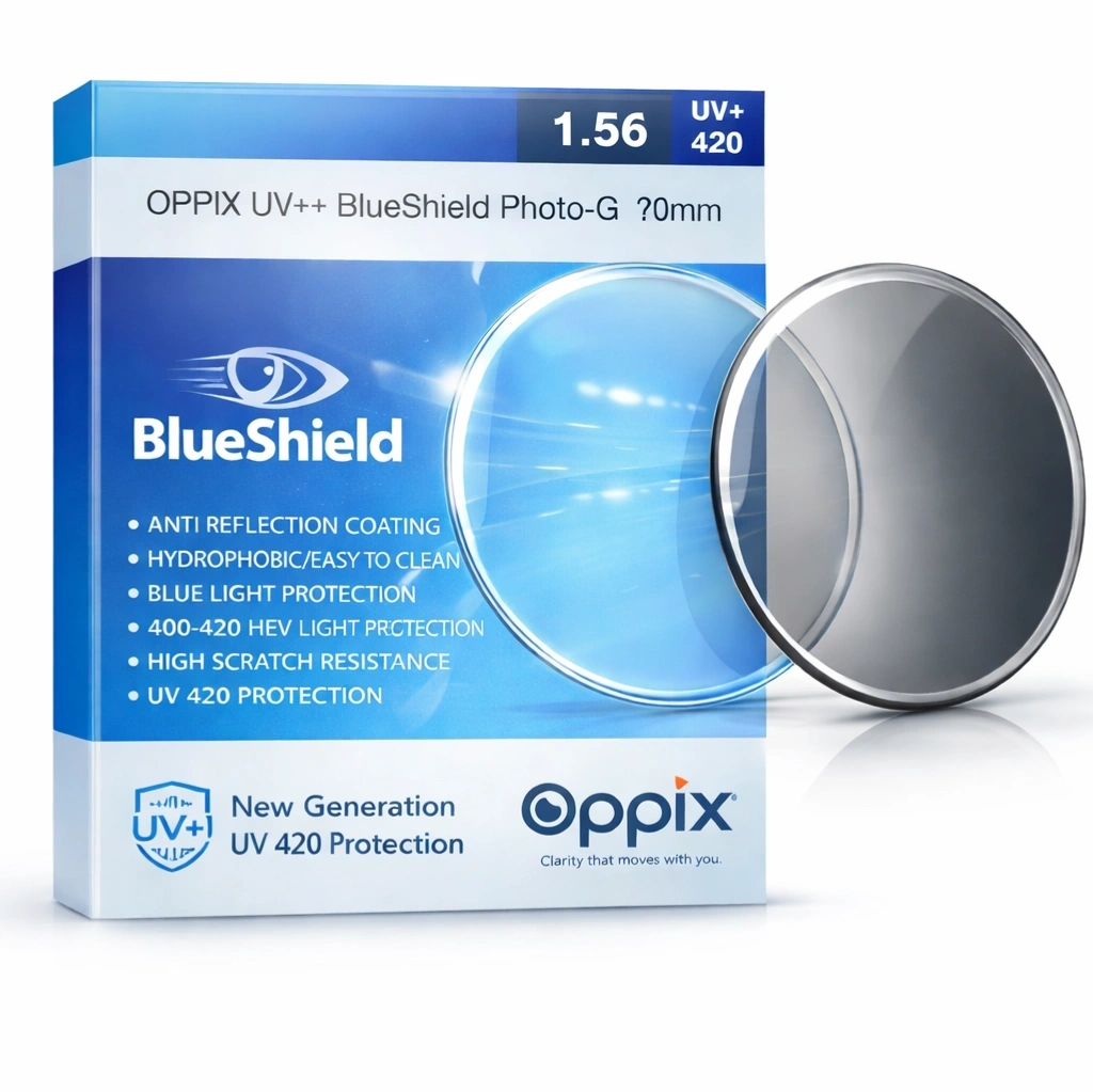 Oppix BlueShield Photo-G lenses intelligently adapt to changing light conditions. They remain clear indoors and automatically darken outdoors when exposed to UV light, giving you comfortable vision in every environment.