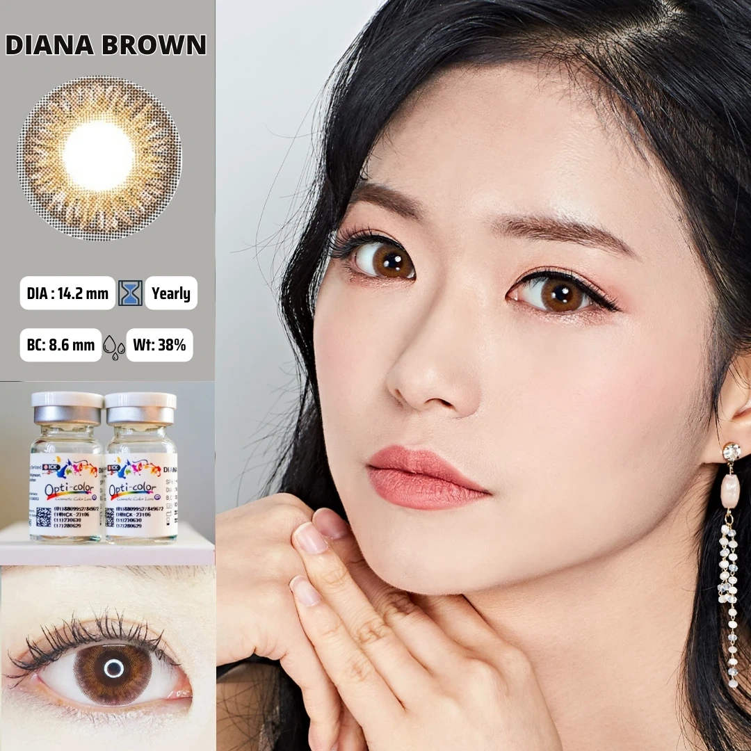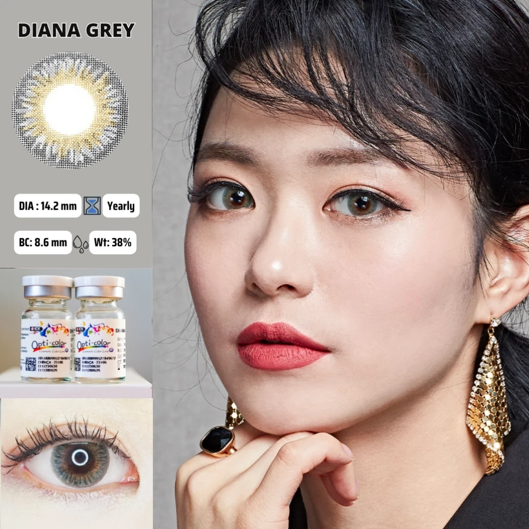 Opti-Color Yearly Disposable Contact Lenses are soft cosmetic contacts (often in Diana Grey or Blue) featuring a 14.2mm diameter, 8.6mm B.C., and 38% water content made of Polymacon. These South Korean-made lenses offer yearly usage, come in sealed vials (1 pair), and are available with or without power, ensuring a bold, comfortable look.